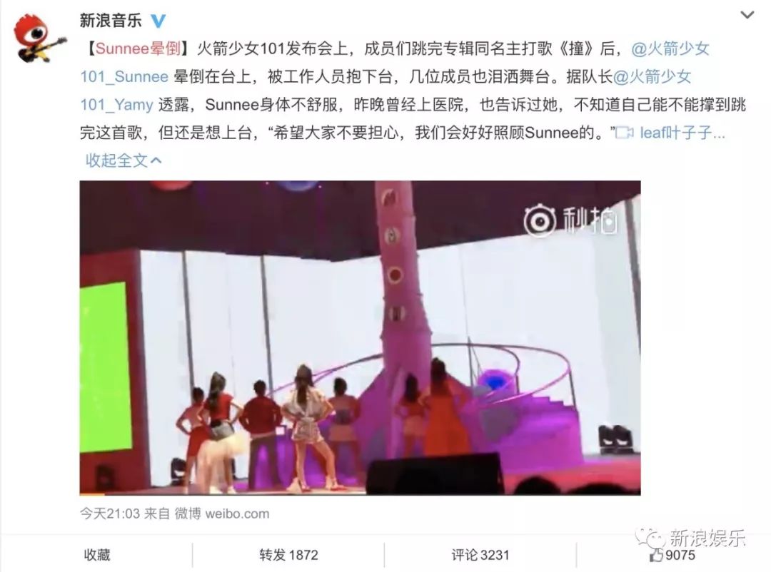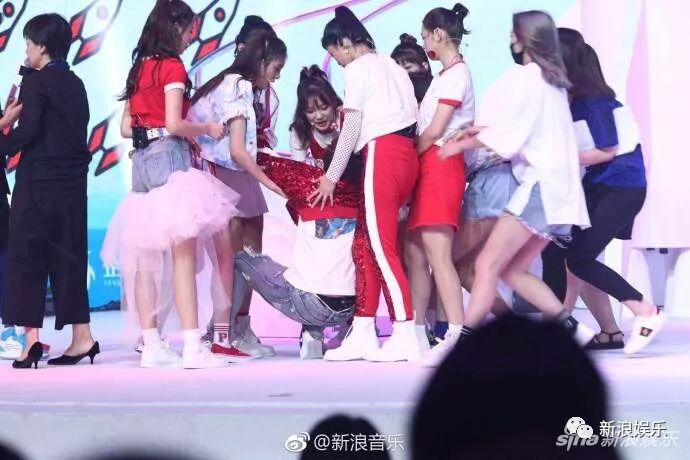 在火箭少女101的新歌舞台上,Sunnee突然晕倒,身边队友赶忙将她扶住。