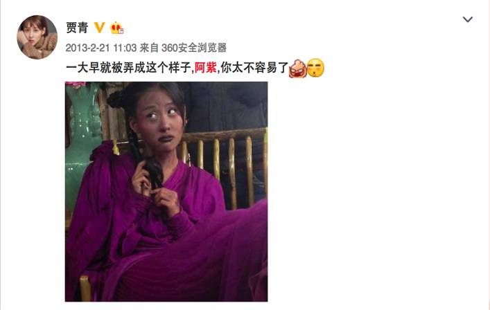 剧中的阿紫初次登场,便由于满脸紫黑,被网友调侃仿若身中剧毒。虽然贾青精彩的演绎让阿朱和阿紫活灵活现,还是由于造型牺牲了不少荧幕形象。但是,这对于贾青来说,通通不是事儿!她曾经在某访谈节目谈及此事,力挺导演的安排。她表示,只有这样鲜明的造型才能将阿紫演绎的更加分明,这样观众越发能感受到后期失去阿朱,乔峰面对相同长相不同性格的阿紫时,那更深的心碎。