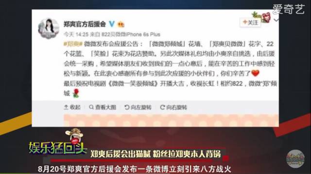 【娱乐猛回头】粉丝栽赃郑爽请客不付钱?姚晨再陷出轨悬... 爱奇艺娱乐 内地女星 2016-08-25 08:38:57 615 创作不易,用心坚持,欢迎请BaGua喝几杯爱心咖啡!打赏并支持本文 打赏并删除本文 点击上方“爱奇艺娱乐”可以订阅哦本期精彩看点 黑锅年年有,今年特别多。郑爽后援会出了资金问题引发不满,大粉拉来郑爽本人背锅。本来出轨火力对准马荣,姚晨一个回复又让出轨疑云罩在头上。林志颖秀新水果机屡屡打脸只能把锅甩给朋友。20块的乒乓球比赛门票被黄牛炒到一千块,还不是怪张继科马龙迷妹太多入了追星的大坑。诸位明星先把黑锅放下下来,歇会儿。更多无观点 1、郑爽后援会出猫腻 粉丝拉郑爽本人背锅2、姚晨手撕网友 出轨传闻又甚嚣尘上3、林志颖秀手机掉粉600万 专注甩锅朋友二十年4、乒乓球门票贵上天 都怪马龙张继科迷妹多8月20号,郑爽官方后援会发布一条微博立刻引来八方战火,微博公布了郑爽新剧发布会上的应援公告,告诉大家各项用款,以及给记者媒体准备的应援物有手偶进口啤酒口香糖等物品,没想到应援物品让其他粉丝不满意,比如西游记手偶就被粉丝吐槽:这什么东西也好意思送出去,太丑了,拒绝!最让人难以接受的是住宿费竟然花了一万多,占了总分用的四分之一,基本其他应援活动没有过住宿费从后援会出钱的,更何况这次应援资金还是众筹的。官博给出了更令粉丝愤怒的解释:应援物和住宿地点都是郑爽指定的。但是即便是指定的账目依然不对,那家酒店一万块只能住两晚还只有一个房间,几十个粉丝是怎么住的?黑锅太多郑爽背不过,最终这次应援的对接给出了解释,住宿款是被后援会之前负责应援的大粉骗了。8月19号,姚晨发了一条祝福丈夫曹郁生日的微博,随后下面评论就有人说:你应该感谢凌潇肃,如果没有他当时的一忍再忍,你现在比马蓉好不到哪去。姚晨立刻拿出了排山倒海的气势打出一记左勾拳回复该网友:呵呵,究竟是谁一忍再忍?真是谣言传久了就成了真。又一记右勾拳回复了另一名说她引导舆论黑前夫的网友:我没说话还能引导舆论?我要是牛到这个地步,现在还会有你这种渣子说话的份儿?秋天来了,又到了新水果机发布的季节,各路果粉都开始蠢蠢欲动。林志颖又如同往年一年,含蓄地告诉网友他有了最新的水果机,但是没想到这一晒让他掉了600万粉。起因是第一条微博发出来显示的客户端前面是肾7但是后面还连着肾六plus,机智的网友秒懂了林志颖并不是真的有了肾7,只是用会员的特权修改了显示的客户端。于是评论里直接有人喷林志颖是装叉之王。之后林志颖发了一条微博显示的客户端是“I几重要吗”来挽尊,但是网友表示:不!买!账!毕竟同样的戏码林志颖已经演过了N次了。追星成本越来越高,如今都要买不起一场乒乓球比赛的门票了。8月22号,中国乒乓球队粉丝俱乐部发布一条微博,号召大家别买黄牛票,原来是8月28号的奥运冠军香港表演赛的门票被黄牛党盯上了。同一天又有网友爆料黄牛炒票丧心病狂,原本二十块钱的门票被炒到一千,这还能不能愉快的看一场球了?长按右侧二维码关注爱奇艺娱乐点击“阅读原文”围观猛宝宝 创作不易,用心坚持,欢迎请BaGua喝几杯爱心咖啡!打赏并支持本文 打赏并删除本文 感谢您的支持鼓励,我会继续努力的!文章地址:用户邮箱:打赏金额:USDT 请输入数字点击”去打赏“,即可进行打赏支持本文章哦 郑爽 About the Author 爱奇艺娱乐 功能介绍:爱奇艺娱乐频道http://yule.iqiyi.com,提供每日最新娱乐报道、明星动态、音乐演出、影视资讯! 官方认证:北京爱奇艺科技有限公司 Related Posts 欧豪:“其实还想演喜剧”|明星微纪录 2020-07-10 22:06:02 周深是如何成为全民香饽饽的? 2020-03-30 22:48:49 独家专访丨李庚希:我和英子一样爱较劲 2019-08-22 21:08:00 李维嘉和龙丹妮终于大结局了…… 2019-06-10 22:09:07 许志安,为什么你背着我爱别人? 2019-04-16 20:53:00 发表评论