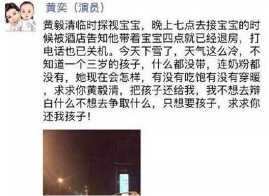 娱乐圈最能闹腾的夫妻档,除了黄奕黄毅清,真的也是没sei了。继连番上演的家暴、离婚狗血剧情,现在抢女大战又鸣锣开炮。近日黄毅清私自带女儿出境,连发N条微博证明自己离开祖国;网曝黄奕发文求助,惦记女儿是否吃饱穿暖,更哀求男方“求求你还我孩子!”据爆料,黄奕已报警处理。2014年黄奕黄毅清离婚,孩子判给女方抚养,但黄毅清曝见不到女儿,要争抚养权。