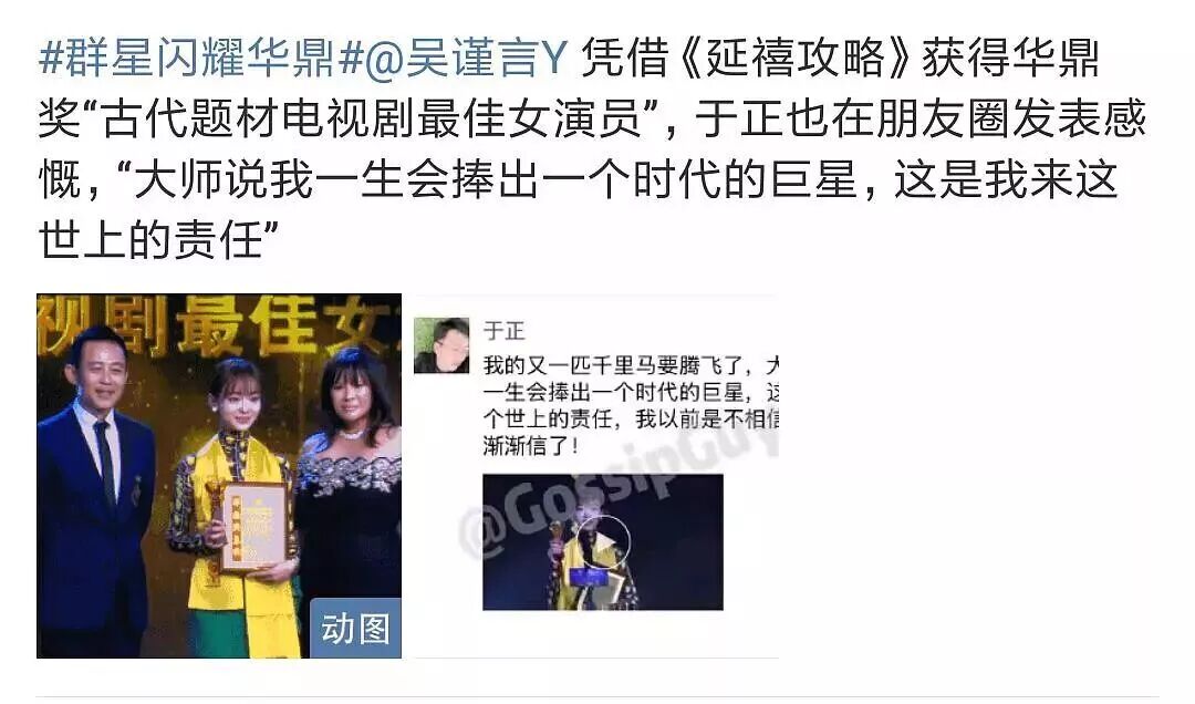今年的华鼎奖已经结束,吴谨言凭借在《延禧攻略》里的表现拿到华鼎奖古装题材电视剧最佳女演员,之后有网友曝出于正在朋友圈感慨称“大师说我一生会捧出一个时代的巨星,这是我来这世上的责任”。