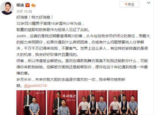 今天杨迪发微博表示自己已经收黄明昊为徒弟,还po上了拜师留念的照片,这并不是开玩笑,以后黄明昊真的就是杨迪的徒弟了。
