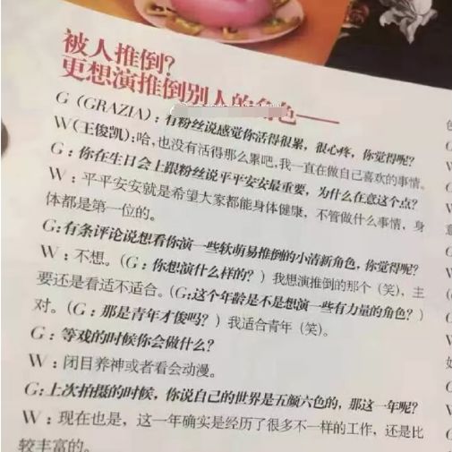 王俊凯在最近参加采访的时候,被问到演戏想被人推倒还是想推倒别人,王俊凯很肯定表示自己想要演推倒别人的角色。