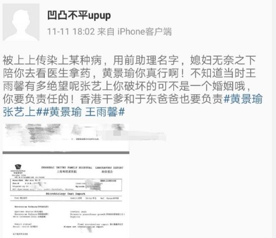 今天爆料黄景瑜黑历史的号又出来爆料了,称黄景瑜和张艺上在一起的时候被传染了性病,黄景瑜以助理的名义跑去看病,还是当时的妻子陪他去医院拿药。