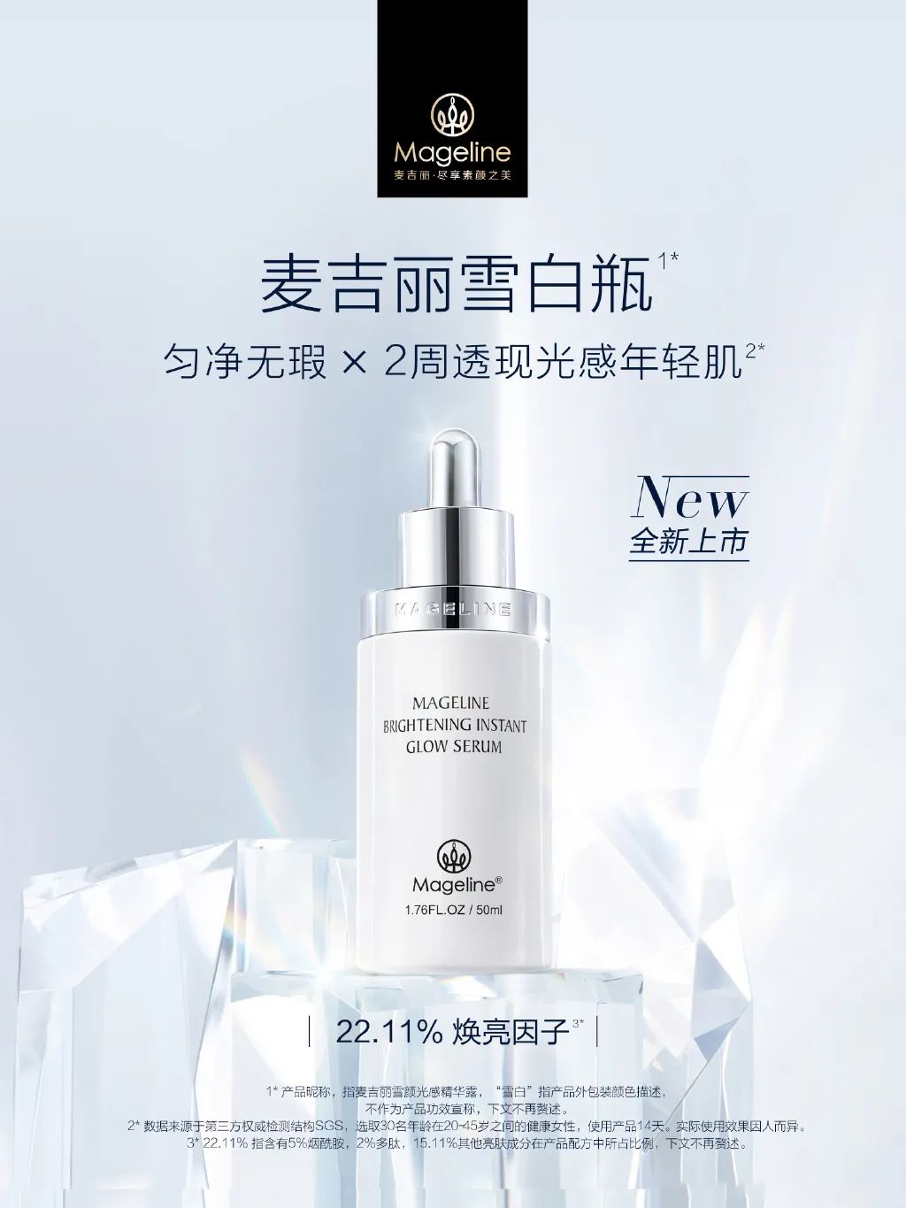 雪白瓶中的重磅突破,是麦吉丽专研的光感黑科技——MAGE-WHIT³*,它科学复配22.11%⁴*焕亮因子,达到五维科学亮肤——1抑制黑色素在肌底生成,2阻止黑色素传递至表皮,3加速肌肤黑色素代谢,4抗氧化强韧肌肤抵御损伤,5全面加速肌肤焕新,链路式层层焕亮肌肤。