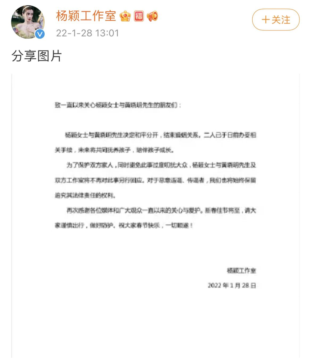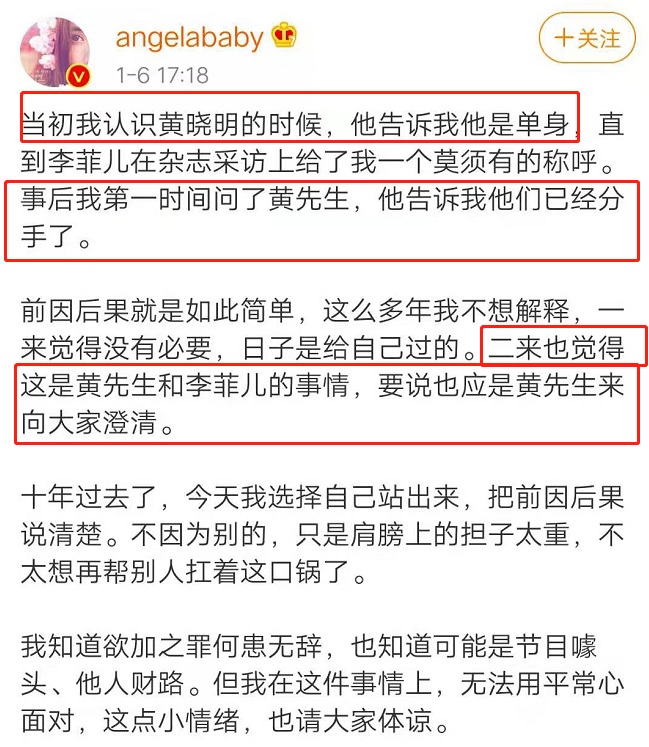黄晓明Angelababy官宣离婚,其实一切早有预兆 周冲的影像声色 港台女星 2022-01-28 14:40:15 639 创作不易,用心坚持,欢迎请BaGua喝几杯爱心咖啡!打赏并支持本文 打赏并删除本文 我一定要让她实现她的愿望,我一定会让她变得非常非常好。——黄晓明1月28日中午,一个世纪大新闻爆出:黄晓明与angelababy官宣离婚。两人发布同样的文案:感恩过去所有,未来仍是家人。随后,黄晓明、杨颖工作室发布声明。声明中称,两人已和平分开,结束婚姻关系。二人已办妥相关手续,未来将共同抚养孩子,陪伴孩子成长。至此,7年婚姻,画上句号。2014年,两人公布恋情。2015年5月,两人举行轰动娱乐圈的世纪婚姻。走到如今分崩离析,不过6年多时间。曾经,他们甜蜜如斯。如今,还是成为陌路。不免令人叹息。但你若细心,一定会发现,他们离婚,早就有端倪了。最明显的,是《乘风破浪的姐姐》第二季热播前,Angelababy的互撕。当时,黄晓明和李菲儿被曝在台上有互动,李菲儿喊黄晓明”晓明哥“。一时间,冲上热搜。这一回,Angelababy没忍。她公开发声明,否认自己是小三。黄晓明也回应了。力挺Angelababy:“baby不是小三,一直以来的传言都是纯属子虚乌有。”随后,他又特别霸道总裁范儿,喊话:“有什么话都冲我来,我的评论永不关闭!”4天后,黄晓明称,已退出《乘风破浪的姐姐》。算是很维护Angelababy了。除了这件事,在前几年,他们也爆出离婚传闻。那是中秋晚会前夕,各大官媒的宣传稿。8月27日,新浪综艺首次透露了演员阵容。奇怪的是,作为专业媒体,他们竟先后修改了文案。第一次,他们发文称:黄晓明杨颖夫妇。9分钟后,又将“黄晓明杨颖夫妇”,改为了“黄晓明杨颖”。看重点,去掉了”夫妇“二字。很多人以为是误发,但纵观其他明星夫妇的写法,如包贝尔包文婧夫妇、林志玲夫妇,依然为夫妇称谓,没有变动。这就奇怪了,到底发生了什么?再看其他官媒的声明,同样如此。就连一向谨慎的央视新闻,也将黄晓明与杨颖分开写。这,似乎预示着,他们已从夫妇,变成了单独的两个人。难道,离婚了?!双方均没有给出答案。但,他们的反常行为却持续进行着。晚会当天,一向同台秀恩爱的他们,竟没有同台演出。黄晓明与伊丽媛一起,合唱了《但愿人长久》,被网友狂骂表情浮夸。而Angelababy,则与蔡国庆合作,唱了首《回家的路》。因不同台,次日便上了热搜,网友纷纷追问:黄晓明为什么与baby不同台?没有人给出答案。但,细心的网友发现,这之后,他们更奇怪了。在后台接受专访时,两人也是分开进行讲话。还有更令人震惊的,有知情人爆料,黄晓明与baby没有住同一个酒店。种种迹象已表明,他们的感情,岌岌可危。但其实,比这更早的,还有更令人惊异的。当初他们的离婚传闻日益发酵,两人还一同出席了活动,外界一致以为,是破流言的行为。但整场活动下来,他们的举止令人十分不解。进场时,Angelababy全程冷着脸,对黄晓明不理不睬。上台后,Angelababy独自前行,黄晓明则帮她提着裙摆,一副”好老公“的模样。但怎奈Angelababy不回头,全程零交流。等一切就位,黄晓明似想缓和气氛,伸出手去握向Angelababy。可Angelababy,竟不漏声色避开了。场面要多尴尬有多尴尬。以至于看过视频的网友都说:他们应该早就离婚了。如今,这一切成了真。恩爱模样荡然无存。看到此情此景,不禁令人唏嘘,当初依附在黄教主身边的baby,在今天这一刻,地位竟完美替换了。如今黄晓明拼命讨好,她却竭力避嫌。令人感慨!但,又不得不承认,他们的结合,在恋爱最初,便不被人看好。即便到现在,也掺杂着质疑声。他们是典型的不对等恋爱。黄晓明曾公开说,他与baby恋爱时,许多人觉得不般配,认为Angelababy配不上他。时间倒回2009年。那时黄晓明正当红,他因《神雕侠侣》、《新上海滩》、《鹿鼎记》等影视剧,径直跻身一线男星行列。因人气高,还一举拿下亚洲首位Gucci产品的代言。一年后,又成功进入《福布斯》中国名人榜第16名。名气与财富直达巅峰。与此同时,他也很有商业头脑,当华谊上市时,入股成了持股最多的演员。据说,曾是华谊第三大股东。那时的黄晓明,人气、资源、实力、影响力,皆为顶级。但Angelababy却没有他的好运气。彼时她已在香港打拼6年之久,仍是一名模特,绯闻缠身。港媒笔下的她,风评极差。一会儿说她整容。一会儿又称她与文咏珊抢资源。当时的Angelababy,四面楚歌,资源也确实不好。据她自己称,“到目前为止,我最好的工作就是能够和Jay Chou一起工作”。意思是,最令她骄傲的,是在周杰伦巡演中当伴舞。港媒也写到,自那以后,Angelababy每一次访谈,都会反复念叨这句话。但即便相差甚远,命运还是让他们相遇了。Angelababy说,她第一次知道黄晓明,是在香港餐厅吃饭,被电视上一句”这是中国最帅的男人“吸引,于是便抬头看了一眼。但那时的她怎么也没有想到,在不久后,竟会与这个男人产生交集。没多久,黄晓明来香港宣传新电影《风声》,Angelababy第一次见到真人,便惊呼:“哇塞,超级明星啊。”她记住了这个男人。或许就在那一刻,Angelababy有了仰慕之情。巧合的是,没多久,她在朋友的引荐下,与黄晓明正面接触了。当时,黄晓明在KTV唱歌,Angelababy也来了,于是故事拉开了序幕。也不知道发生了什么,自从一起唱歌后,黄晓明对Angelababy便十分关照。没多久,黄晓明推荐Angelababy出演《全城热恋》。这剧汇集了当时的大热明星,井