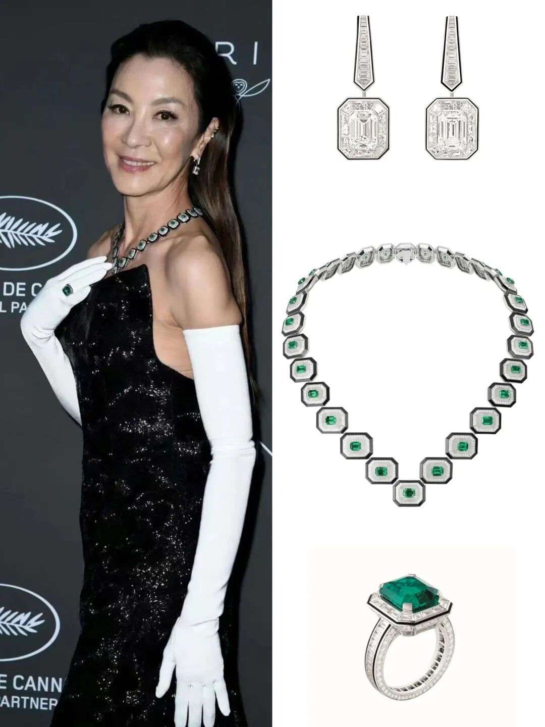 杨紫琼征战戛纳时,这套宝诗龙Histoire de Style - Art Deco 系列高珠也很出圈,祖母绿的“冰糖”不要太华丽,黑框白钻也和衣服颜色巧妙呼应。