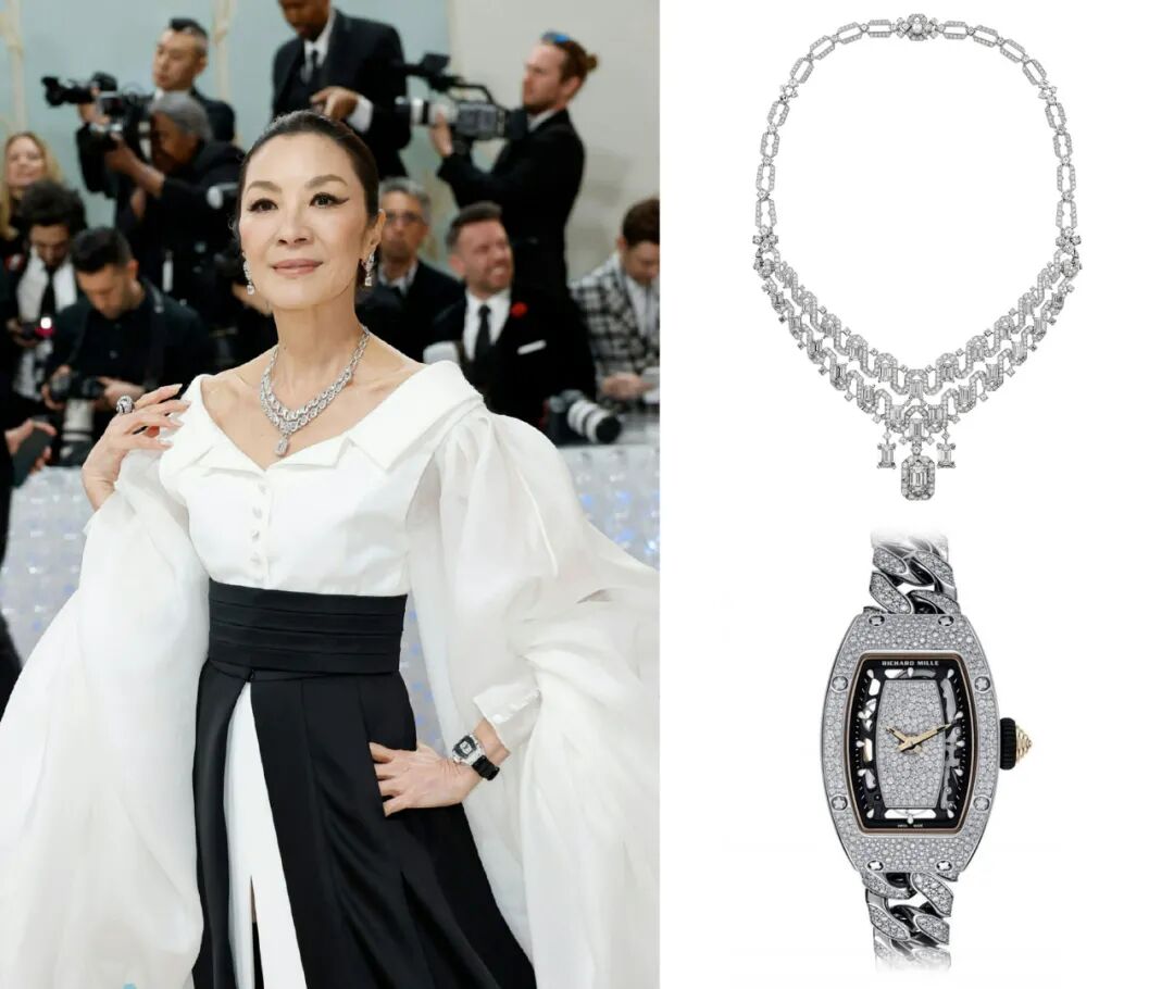 她在Met Gala红毯上用Cartier白钻项链和黑色RM钻表,和黑白礼服呼应的搭配也蛮妙。
