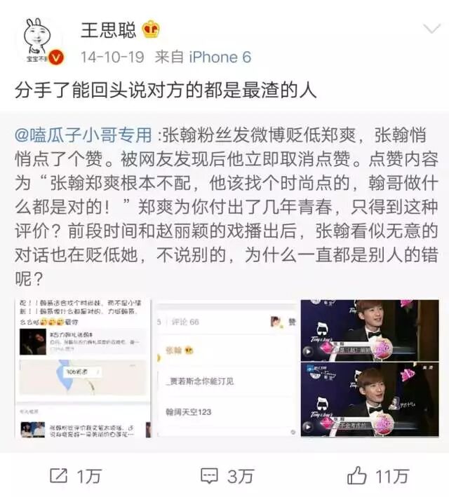 但是让人无法理解的是,分手才几个月的时间,就有网友发现张翰点赞贬低郑爽的微博。试问,这是曾经相爱了五年的男友该有的态度吗?也难怪王思聪都忍不住转发吐槽“分手了能回头说对方的都是最渣的人”。