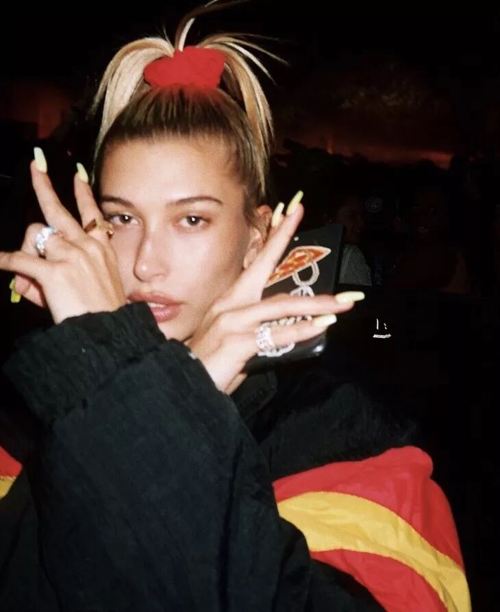 更是多次将发圈带上红毯。在今年以Camp为主题的Met Gala上,Hailey更是身着粉色Alexander Wang露背裙惊艳亮相,黑色发圈衬托下的浅金色马尾性感不俗气,仿佛刚从粉色包装盒走出的精致芭比。