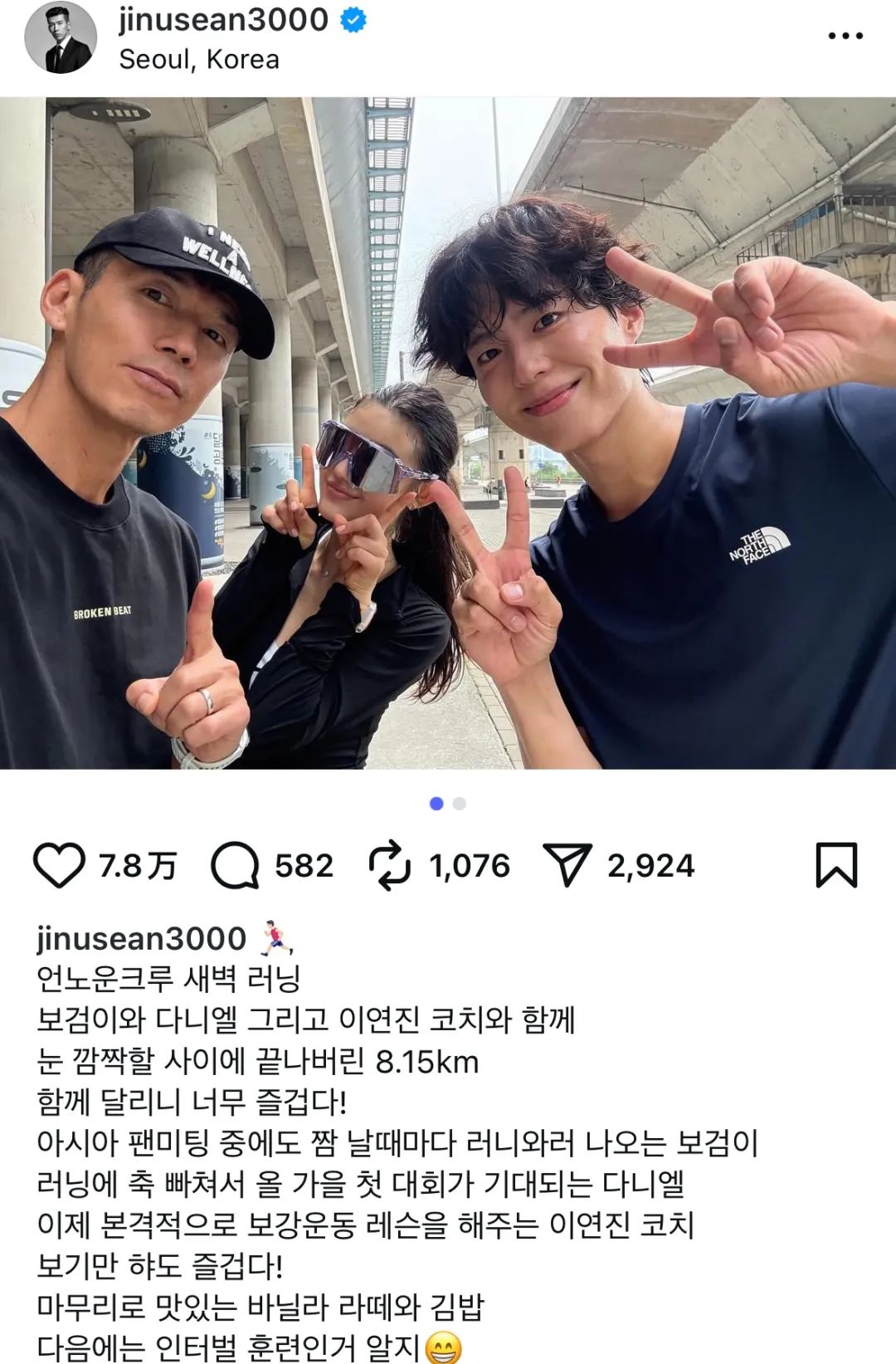 很快,细心的网友就发现这已经不是朴宝剑和DANIELLE第一次一起训练了。早在不久前,SEAN就经常在自己的INS晒出他们凌晨集体跑步的认证照,并配文感慨道:“大家一眨眼就完成了8.15公里,能一起训练真是太开心了。宝剑在粉丝见面会间隙都要抽时间出来跑步,还有首次挑战10km比赛、满怀期待的DANIELLE也精神饱满,再加上辅助训练的教练让整个训练氛围都充满了动力,光是看到这一幕就能让人心情愉悦”。