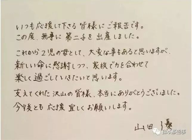 2017年1月21日,山田优在INS贴出亲笔信,宣布与小栗旬的第二个孩子诞生:向支持我的大家“报告”,我们的第二子已经平安出生了。今后我就是两个孩子的母亲了,虽然会遇到困难的事,但我们仍旧感谢新生命的到来,会一家人一起合力度过快乐的时光。一直以来谢谢大家的支持,以后也请多多关照。小栗旬也在自己的官网更新了生子的信息。→【平安生下第二子,小栗旬和山田优的幸福都要溢出屏幕啦!】