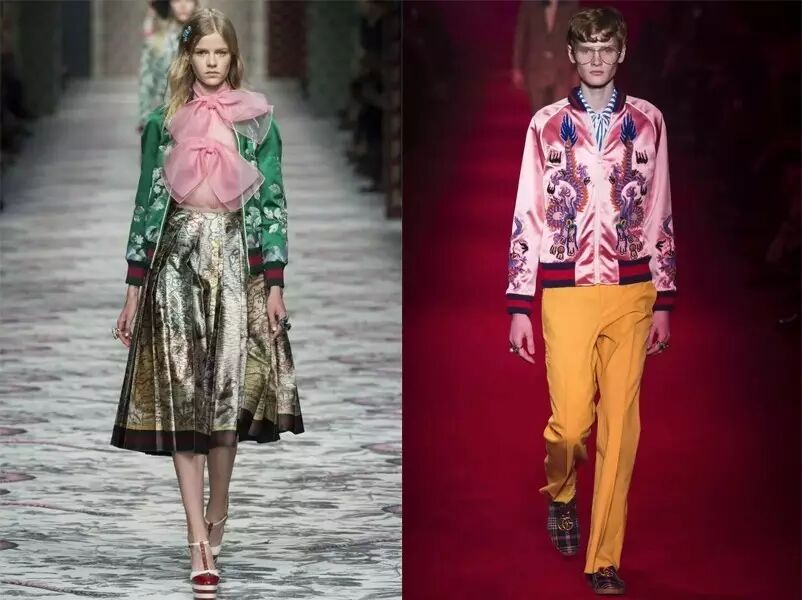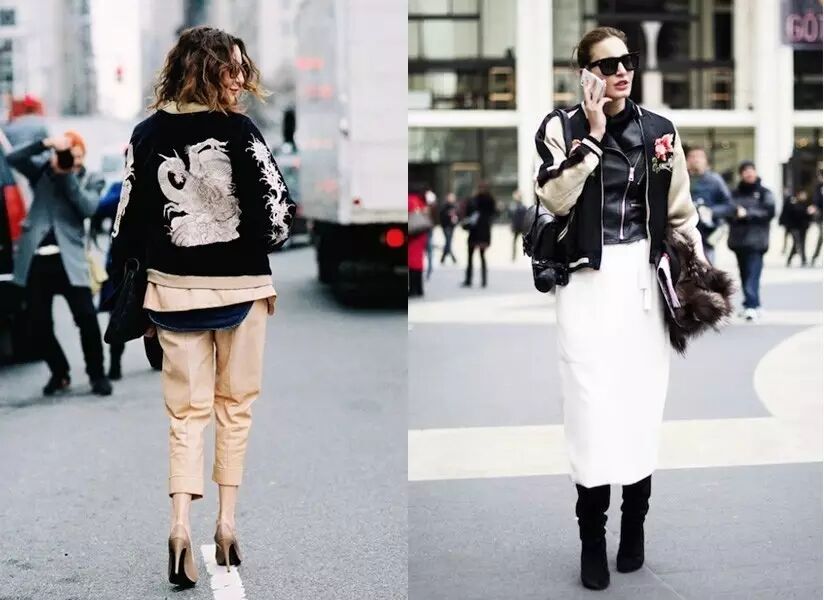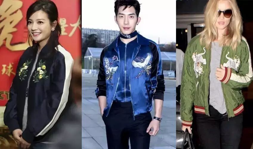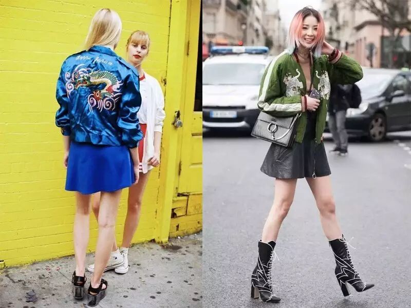 这刺绣简直可以称作“中国风的时尚逆袭”,放在五年前,谁能想到这中国喜被上的刺绣图案也能成为街霸一样的存在?是的,现在不管是奢品大牌还是高街潮牌都将我们熟悉的东方风情元素如龙、凤、花卉图腾,绣在了当下流行的缎面棒球夹克上。欧美人管他叫Bomber Jacket,日本人管他Souvenir Jacket,我擦,老外太会玩~
