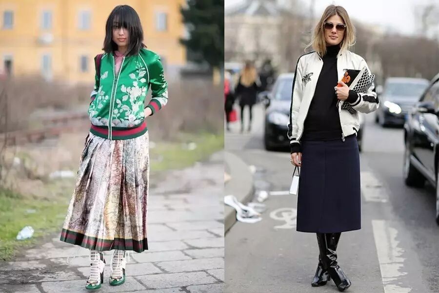 宽松版型的外套格外受到潮人的青睐,无论是工装款还是棒球夹克的改良款,选择同色系的裙子让整体LOOK更和谐,深色系的平底鞋在压住整体色彩的同时会让你出街时候更舒服些!