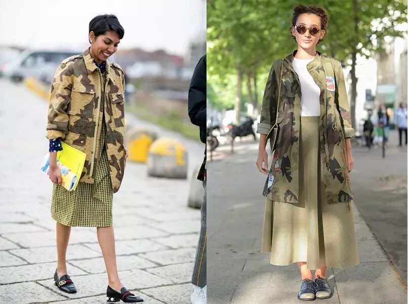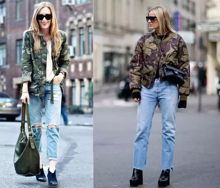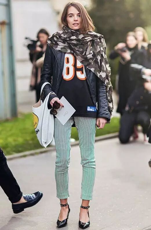 一件霸气外漏的迷彩外套,不仅可以帮你遮挡住这几天阴雨天气的凉意,同时是格外抢眼的单品利器。与破洞牛仔、磨边牛仔搭配起来尽显利落潮人范!选择高跟鞋会比运动鞋和平底鞋更精神些~