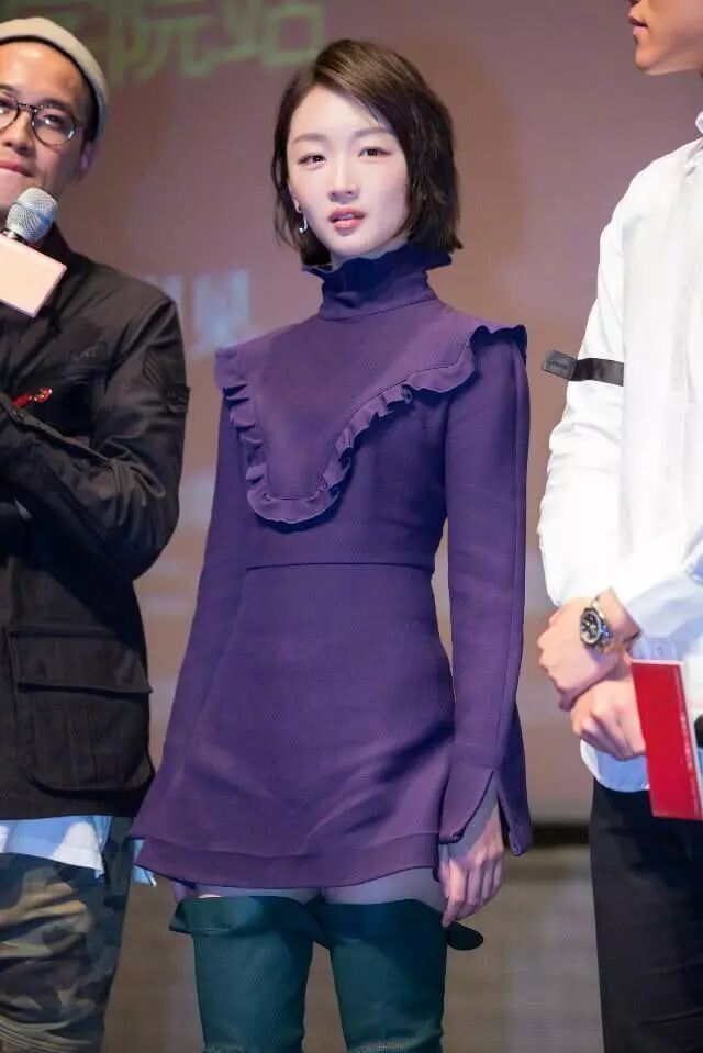 周冬雨穿着一条深紫色的连衣短裙,她把裤子当靴子穿?这一条裤子,只穿到了大腿,感觉有点怪怪的,意外得出了时尚范儿。整个穿搭尽显她的好气质,显得身材高挑纤细,有着不一样的魅力。