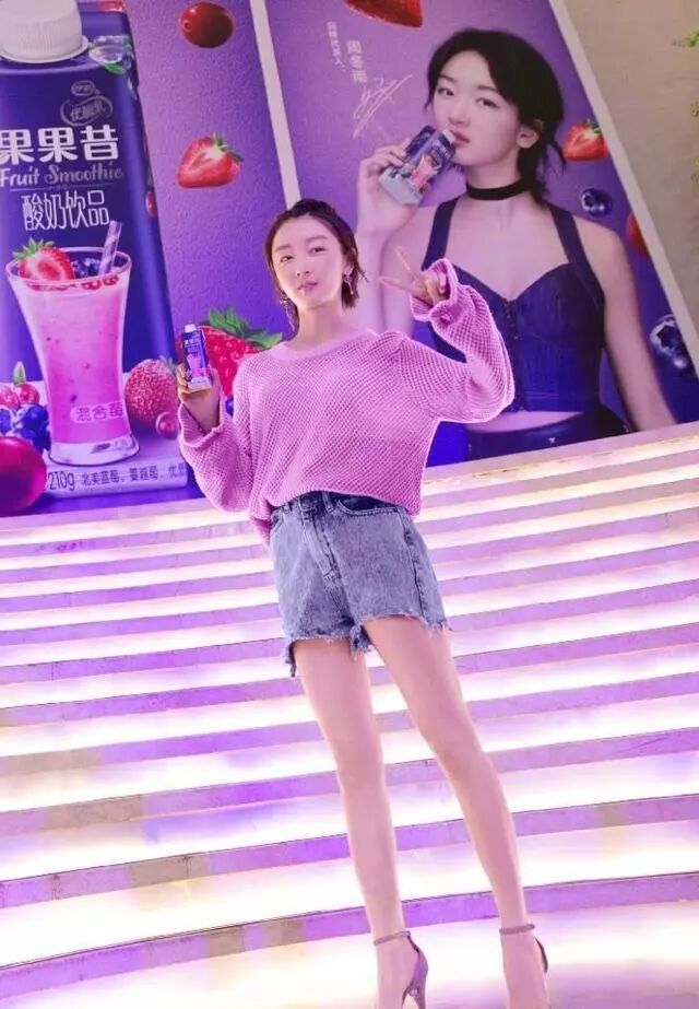我们一起来看一看周冬雨的其他穿搭,她穿着一件紫红色的针织衫,镂空的设计很有时尚感,增添了几分趣味。下半身搭配灰黑色的牛仔短裤,高腰的设计拉长了身材的比例,显得身材更加高挑了。