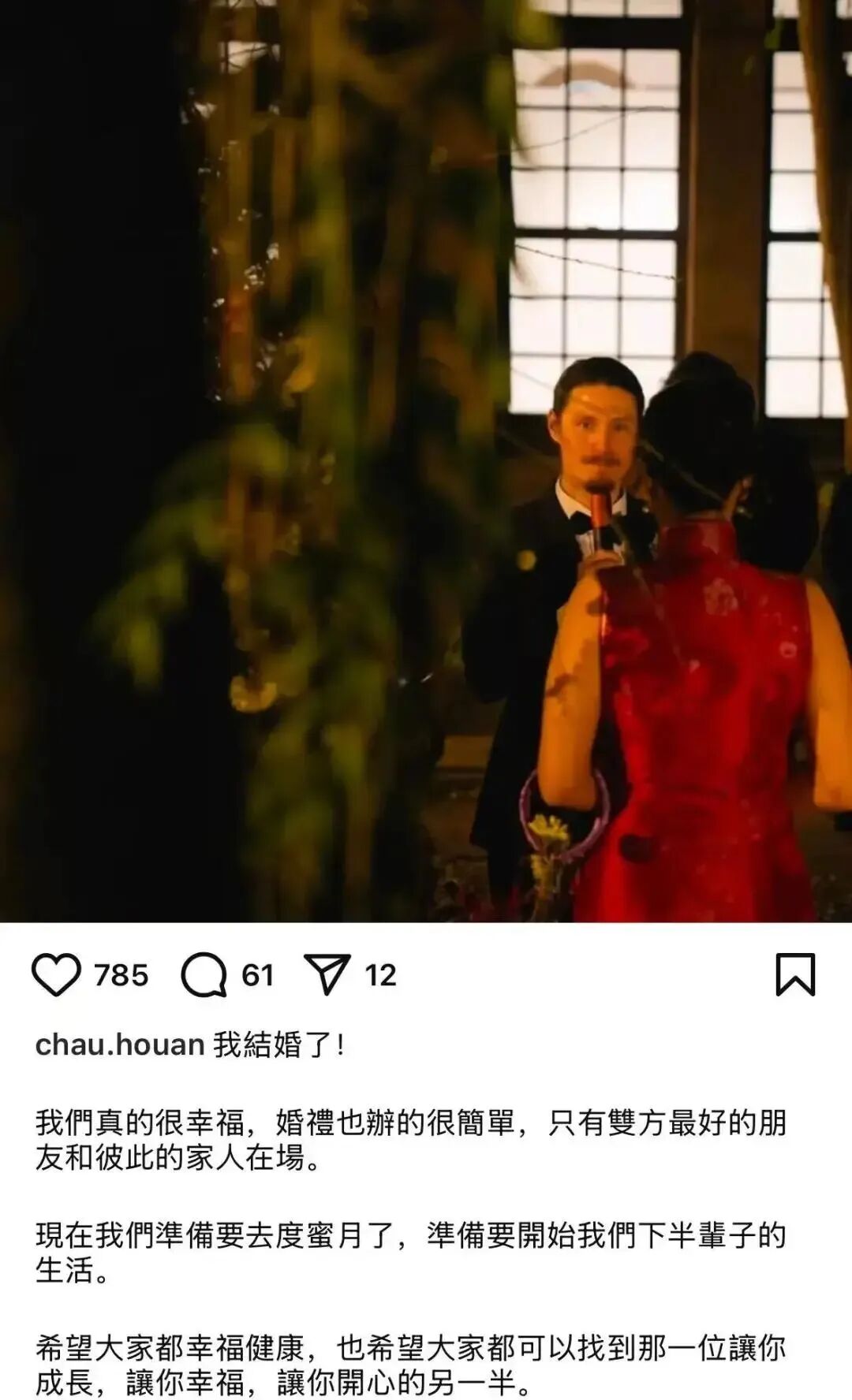 五月底,周厚安在社交平台只写了五个字:“我结婚了!”照片里,他穿着黑西装,笑得有点腼腆,身边的新娘,只有一个背影。