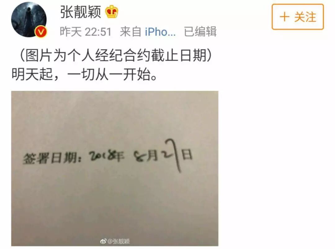8月27日晚,张靓颖晒出一张个人经纪合约截止日期的照片,签署日期是2018年8月27日,并配文“明天起,一切从一开始。”表示已与少城时代正式解除经纪合约。少城时代,又称少城时代娱乐集团,是中国大陆一家知名综合性民营娱乐公司,由张靓颖和冯柯于2009年创立。张靓颖自09年与华谊音乐结束合作后,便和冯轲成立了少城时代,一直发展至今。旗下签约艺人包括:张靓颖、王铮亮、梁博、刘美麟、王晰、谢帝、陶晶莹、文薇、许馨文、裘继戎、潘辰、许镇耀、张力尹、苏立生等。