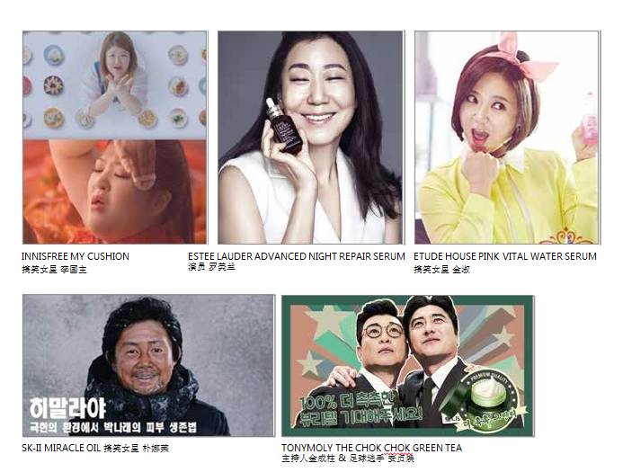 化妆品广告界对美的观点正在发生变化。迎来了具有“美丽”象征拥有清秀五官和光洁皮肤的偶像或富有个性的搞笑女星,又或者是“实力派”演员被大众所关注的时代。这样的变化来自于互联网和SNS使用活跃的当前。INNISFREE将搞笑女星李果主的吃货形象表现出来,公布了将MY CUSHION比喻为食物的广告, SK-II聘请了朴娜莱为代言人,将“喜马拉雅”,“DAY OF THE MUMMY”“THE MARTIAN”等电影中的人物用朴娜莱独特的另类装扮重现,机智的解释出了在恶劣的环境下也可以塑造滋润光彩肌肤。