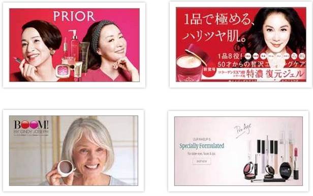 银色市场不断成长的趋势下,不仅是化妆品模特,相配于银色时代的化妆品品牌也陆续登场。在日本、美国,针对60岁以上女性的化妆品品牌活跃登场,证明了年龄不能成为判断美丽的标准。另外,当前的银色一族对打扮自己的需求很强烈的同时还具有较高的收入水平,可看出银色市场将会日益扩大。