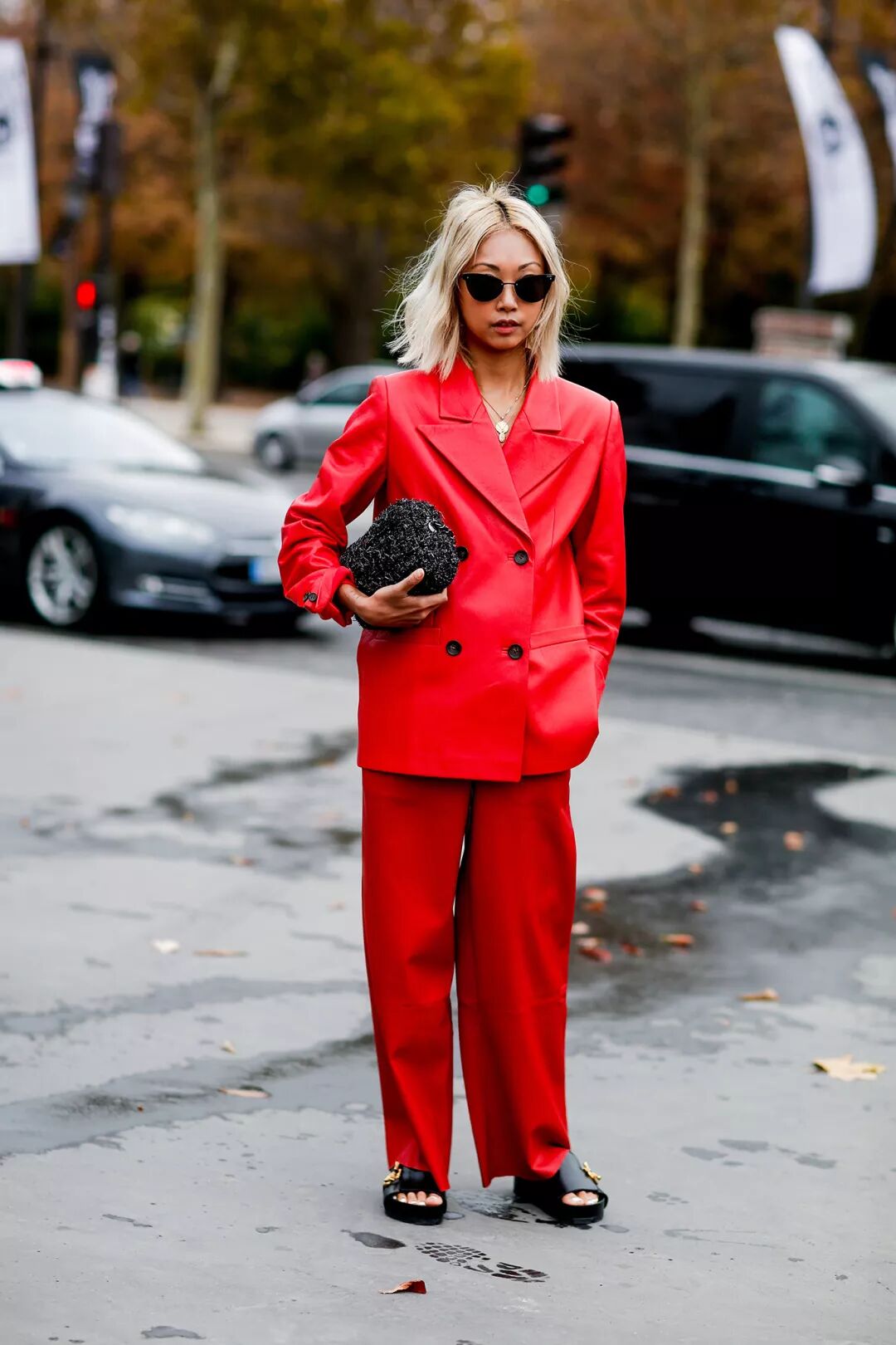 如果想尝试 All red look,身材比例是很重要的一点。在设计上,这套 look 简洁又不失时尚感是不错的出行选择。但是对于 Vanessa Hong 这种小个子女生来说,这套红色西装面料偏硬,如果能露出高腰线,会显得身材更好。