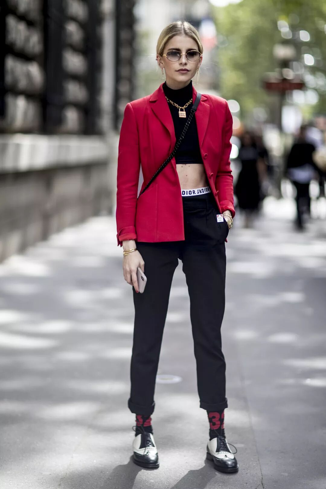 帅气的西装和皮鞋最适合营造中性风,时尚博主 Caroline Daur 的这套look 是经典的红黑搭配。露脐装、卷起的裤边和黑红相间的长袜,都让造型多了一丝趣味性,同时金色的项链和亮色的鞋子,也避免了整体色调的单调。再戴上一副酷酷的墨镜,绝对让你气场 up!