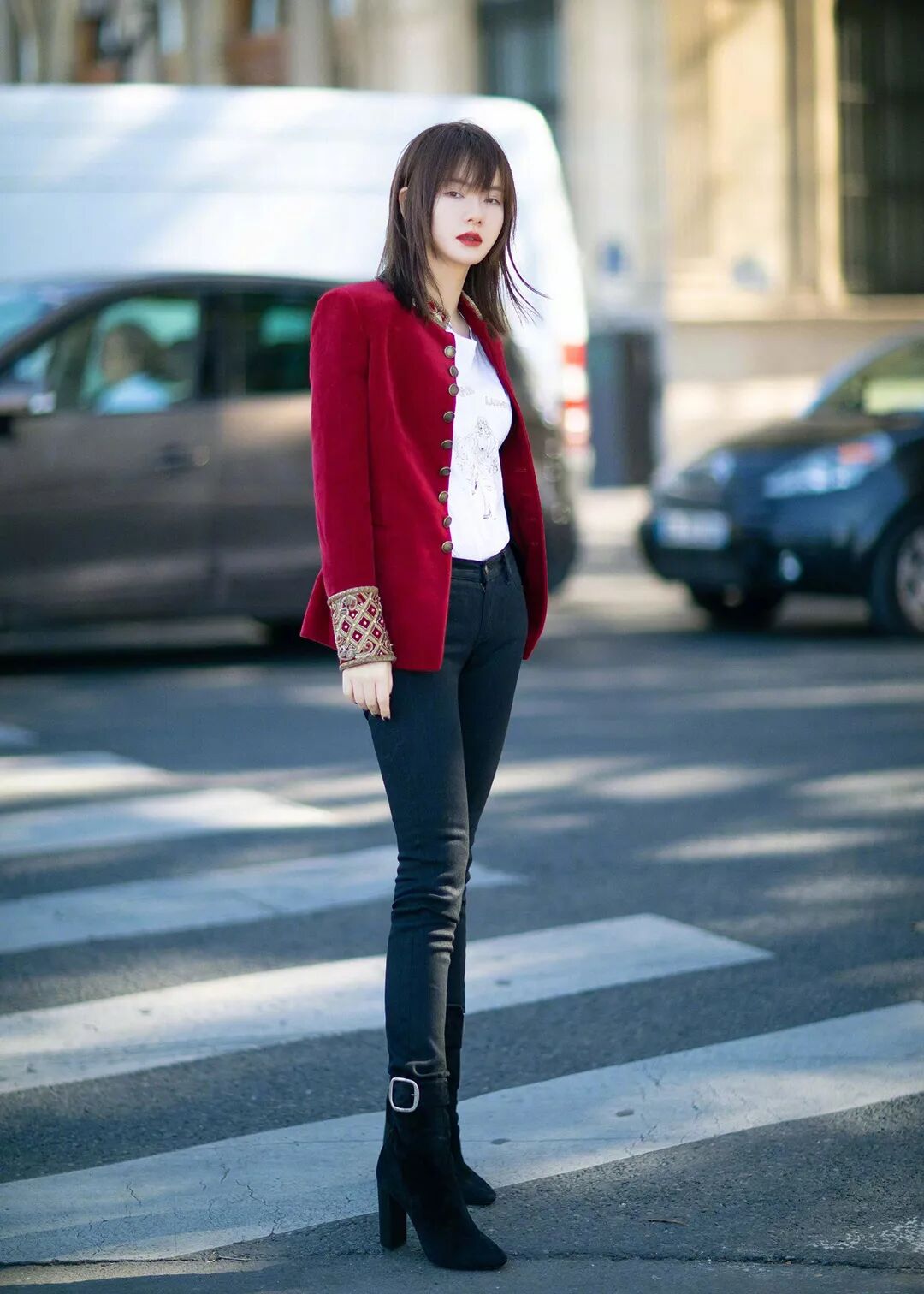 简单的内搭,利落的夹克和紧身裤,这样的搭配实在是很符合戚薇时尚干练的气质。独特的刺绣设计是这件夹克的一大亮点,天鹅绒的面料材质也为整套 look 增色不少。紧身裤和短靴展现出了戚薇令人羡慕的细长比例。如果你喜欢复古感的单品,记得颜色和质感很关键哦!