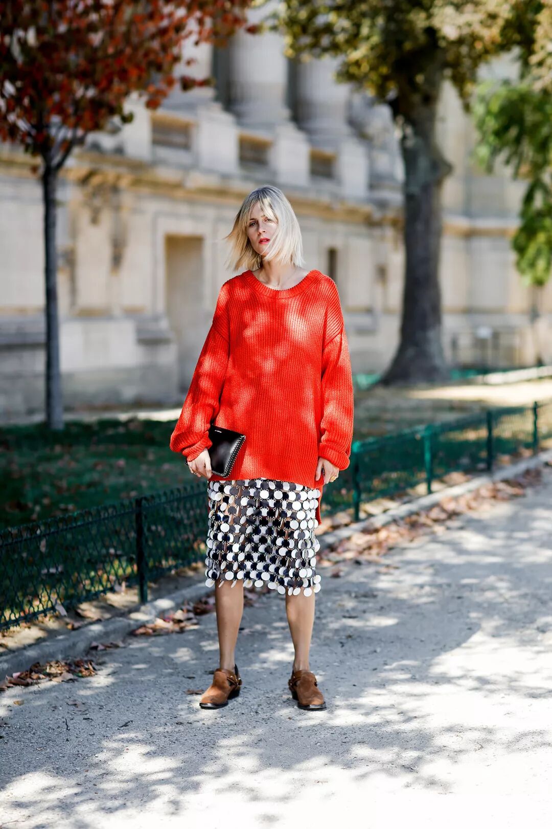 Linda Tol 本人的身材其实是不错的,可这套 look 穿出的效果并不理想。朱红色的针织上衣太过宽松又是落肩设计,单独看的确是会显得肩部较窄,但短裙的材质偏硬,撑宽了臀部,整体视觉比例也会下移。如果这样搭配,可以将针织衫的前面塞短,营造前短后长的层次感,同时提高腰线。或者在高腰的位置加一条腰带也是不错的点缀。