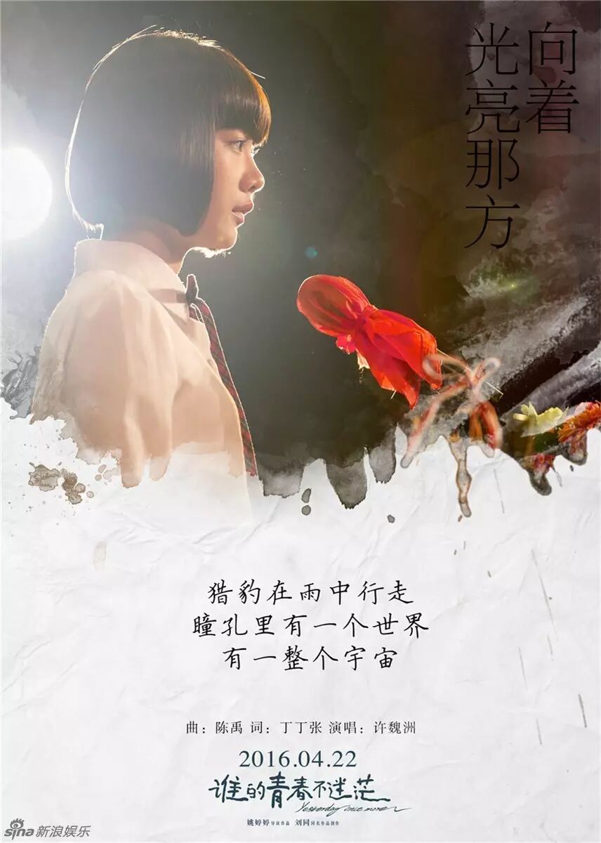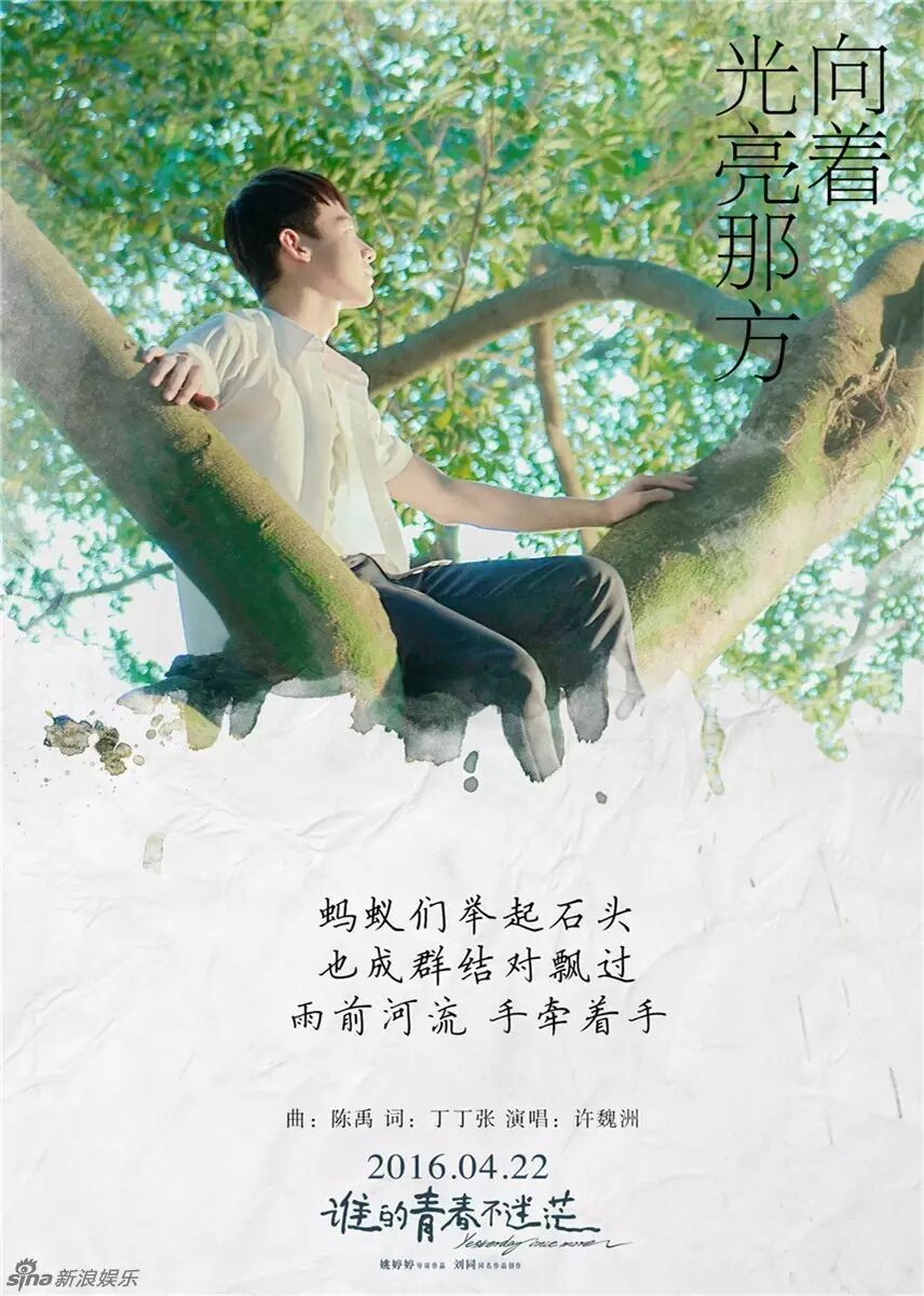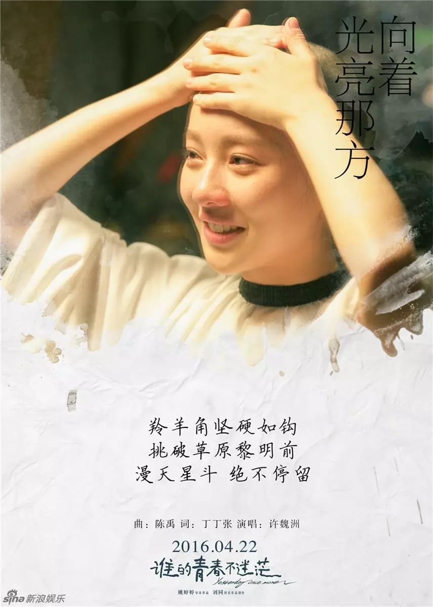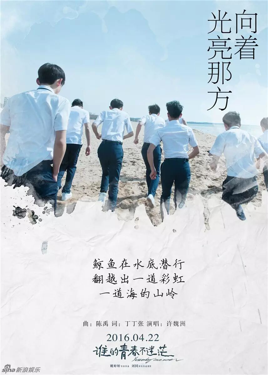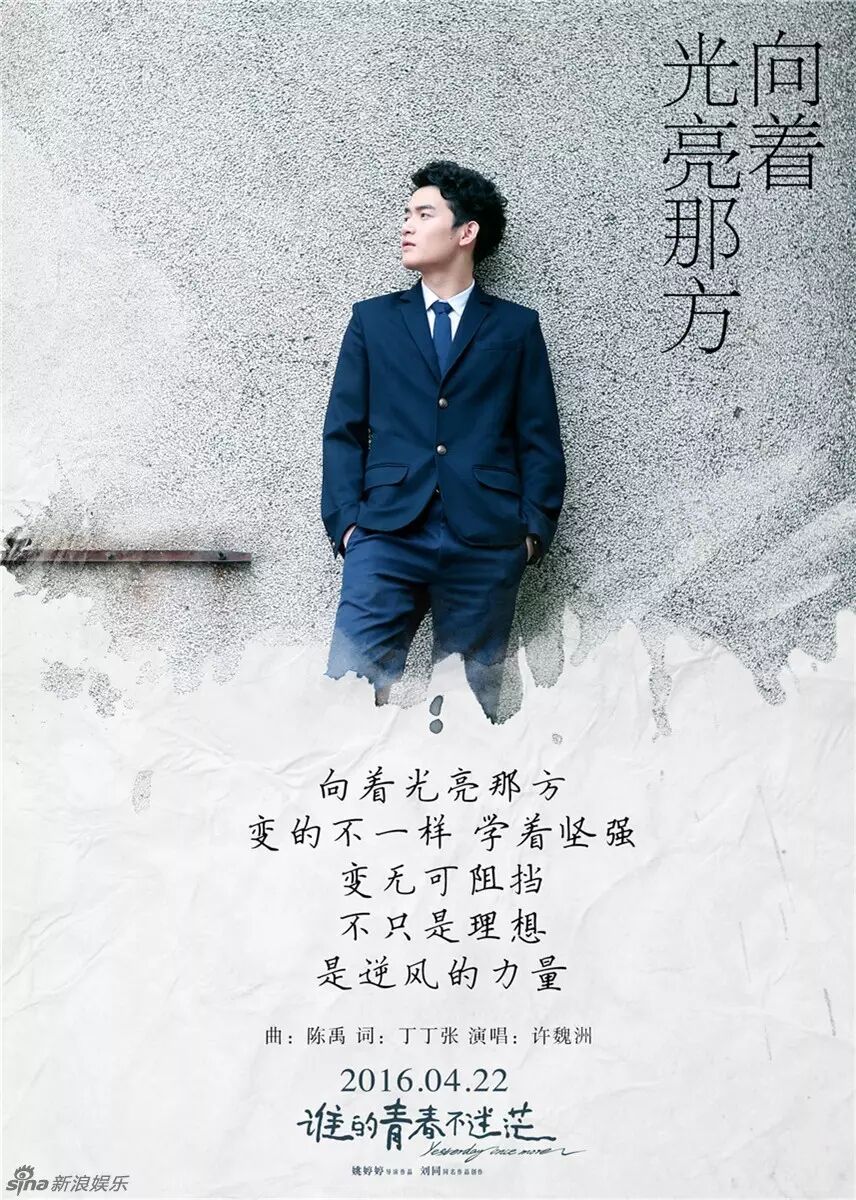 《青茫》热血剧情再曝光 有笑有泪朝着光亮向前 MV剧情从好妹妹在剧中客串的《音乐天堂》电台开始,歌曲缓缓响起,电影中特有的青春场景也陆续展开。高翔和天骄在林荫大道上骑行追闹、停车对望,在校园里欢快地携手淋雨,随着歌曲高潮音乐的上扬,剧情也更紧凑和扣人心弦。天骄在阳光中奋力骑行,在雨中焦急地奔跑和寻找;高翔为了帮天骄圆梦被一群人追赶而摔跤,天骄捂着嘴在角落里不敢出声地痛哭,高翔在火车上听着收音机泪流不止,天骄说:“其实我挺羡慕你的,想飞就能飞起来,我呢,有些事连试试的勇气都没有。” 歌曲的高潮此时再次响起,“向着光亮那方,变得不一样,学着坚强,变无可阻挡,不只是理想,是逆风的力量”。白敬亭背着滑翔翼从屋顶飞起,一脸的笃定与希望;陆田甜和欧小洋不约而同地剃光头,泪中带笑,目光坚定,在人群中对视而笑;林天骄冲下颁奖礼讲台,一路狂奔;几位主角坐上机车,挥拳向前……火车在隧道中飞驰向前,迎来一片开阔的风景,就像光亮的方向,充满希望。“向着光亮那方,变得不一样,不同寻常,变想要模样,不只是理想,是活着的方向。”高翔骑着单车从朝阳的光亮中一路向前,青春里的迷茫和追寻都有了最终的方向。 人气小生许魏洲倾情献唱 青春无畏力量前行 《向着光亮那方》整首歌节奏明快,不管是歌词还是旋律,从主歌的走心到高潮的热血,都充满着青春里独有的力量和希望。和一贯坚持的新人理念一样,电影《谁的青春不迷茫》此次发布的最新推广曲也邀请了新晋人气偶像许魏洲倾情献唱。许魏洲在2016年初的耽美网络剧《上瘾》中正式出道,大受网友欢迎,在第16届音乐风云榜年度盛典更被评为“最受欢迎网剧偶像”。除了表演,许魏洲在音乐方面也有一定积累,在高中时期就组建过乐队,还担任主吉他手。此次许魏洲的演唱,将青春的力量和希望诠释得恰到好处。响亮的旋律配合电影的剧情画面,抒发了青春的无畏和一往无前。青春就要做自己,年轻就是有梦想,迷茫也要向光亮。 《谁的青春不迷茫》,其实我们都一样。2016年4月22日,向着光亮那方,一起去电影院看属于我们自己的热血青春。