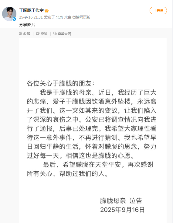 9月11日傍晚,于朦胧工作室发文称:“我们深爱的朦胧,于2025年9月11日坠楼身故。经警方工作,已排除刑事嫌疑。愿逝者安息,愿生者坚强。”
