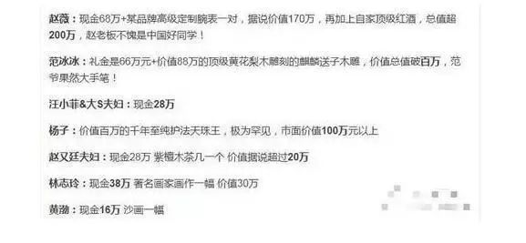 而这其中最值得关注的就是赵薇的了,毕竟赵薇和黄晓明的关系非同一般,相传赵薇送出了68万现金,还有价值170万的一对腕表,此外还有其他礼品,总价值超过200万!