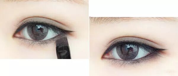 Step 4:用黑色眼影笔沿睫毛根部画一条眼线,眼尾微微拉长上翘。