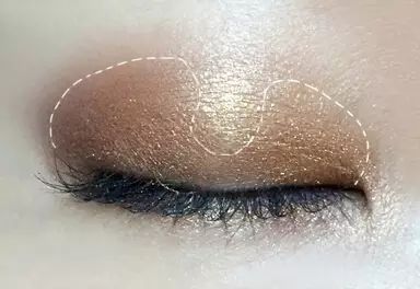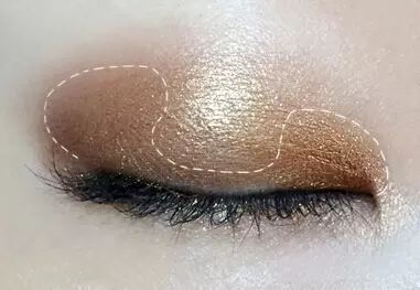 Step 5:上眼皮除去正中间的区域外,其他区域用棕色珠光眼影晕染。