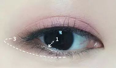 Step 4:在位置1用金色珠光眼线笔画一小段眼线;瞳孔正下方以及眼尾三角形区域即位置3用棕色眼影晕染。