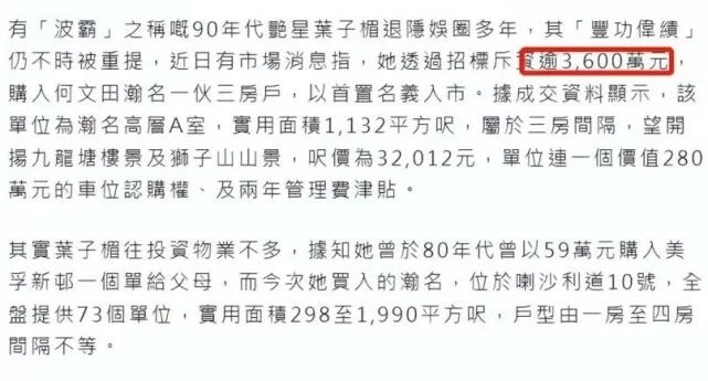 2022年5月26日,港媒曝出,叶子媚花费3600多万买购置房产。