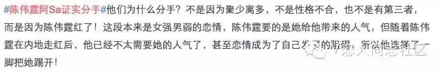 至于分手的原因,一说大师兄陈伟霆借阿Sa上位,成功红了之后,就提出分手,是典型的渣男~