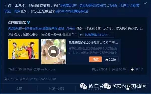 追溯此次微博“基情秀”的起因,源于两人为应用宝拍摄的第二季广告片正式发布。对于此次拍摄的广告片,吴亦凡显得非常开心,在配合品牌方的微博互动中,还邀陈伟霆一起来玩“#就要玩在一起#低头 快乐王冠戴起来@ William威廉陈伟霆”。