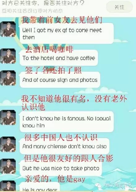 该老外声称陈伟霆身边所有人,从化妆师到造型师,包括他自己均为gay!!!并公布了短信内容`
