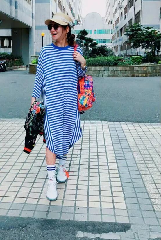 任家萱平时的穿搭也是没谁了!一条蓝色宽松休闲长款连衣裙,直通式的设计,为了遮盖自己的肉肉,长款的裙摆,也不会因为露出伤疤而尴尬。任家萱身穿一双白色平底鞋,运动感十足,复出后的任家萱,性格也有了大改变。