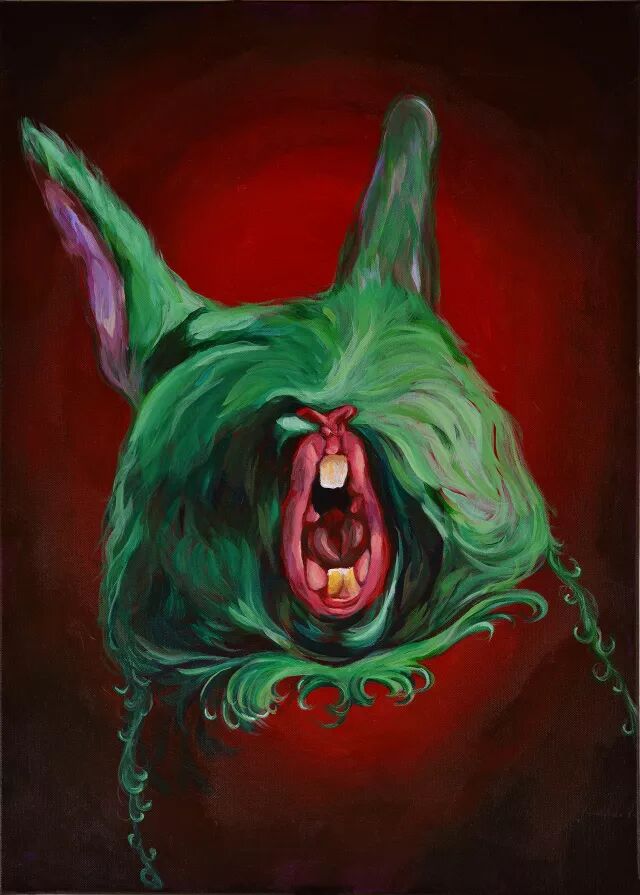 真实原因是我想要绿色和红色所产生的强烈视觉反差来代表自己矛盾的心境,特别是当我感到维持平衡越来越吃力的时候。随着我对生活和艺术的探索逐渐深刻,心境也会随之变得平和,那个倍感焦虑,受尽矛盾折磨的年轻人会随时光一起消失,但她的影子会永远留在这些肖像里,带给正在经历着人生的挣扎的观者们一丝安慰。