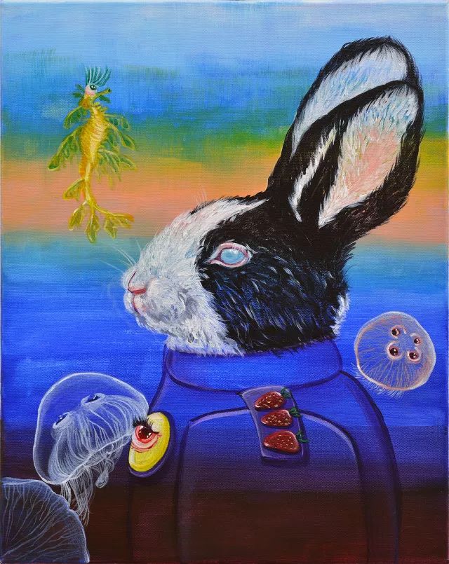 阿雅:绿猫原型脱胎于我养的猫,猫是极灵性的,甚至有人相信猫可以通灵,自由穿梭于阴阳两界之间。的确,猫的静谧和若即若离让人不由得如此联想。但在肖像里,猫的性情被真实地、甚至稍做夸张地表达出来:贪吃、好奇、困倦;兔更加拟人化一些,可能因为兔子胆小、易被惊扰的天性和我本人相似吧。