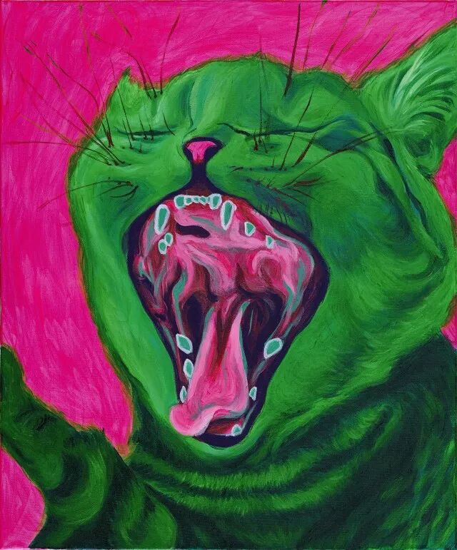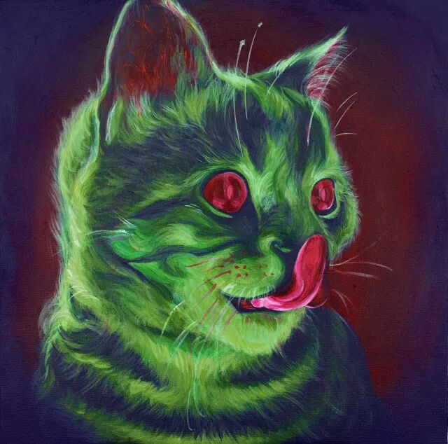 现实社会中人们的精神诉求,是一种可望而不可即的现实存在。它永远都是我们追求的对象,虽然知道它就在那里,却又遥不可及。我就用绿猫或者兔子的肖像来表现生活中的场景,这些场景无不以夸张的手法呈现出来,使它既感真实又游离于现实之外,是一种不真实的存在。
