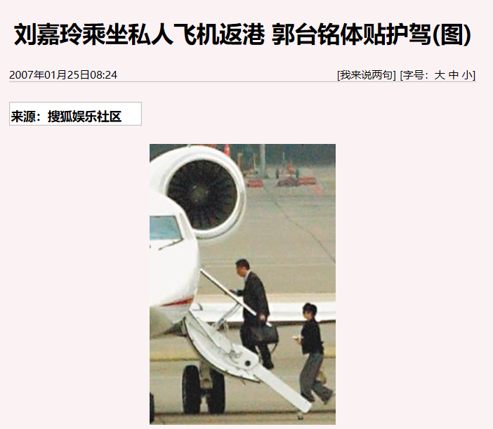刘嘉玲高调与台湾首富郭台铭出席婚宴后,两人绯闻即传得满天飞,嘉玲明知有记者在机场守候,又不避嫌地与郭台铭乘私人飞机返港,以证两人的关系绝对见得光。