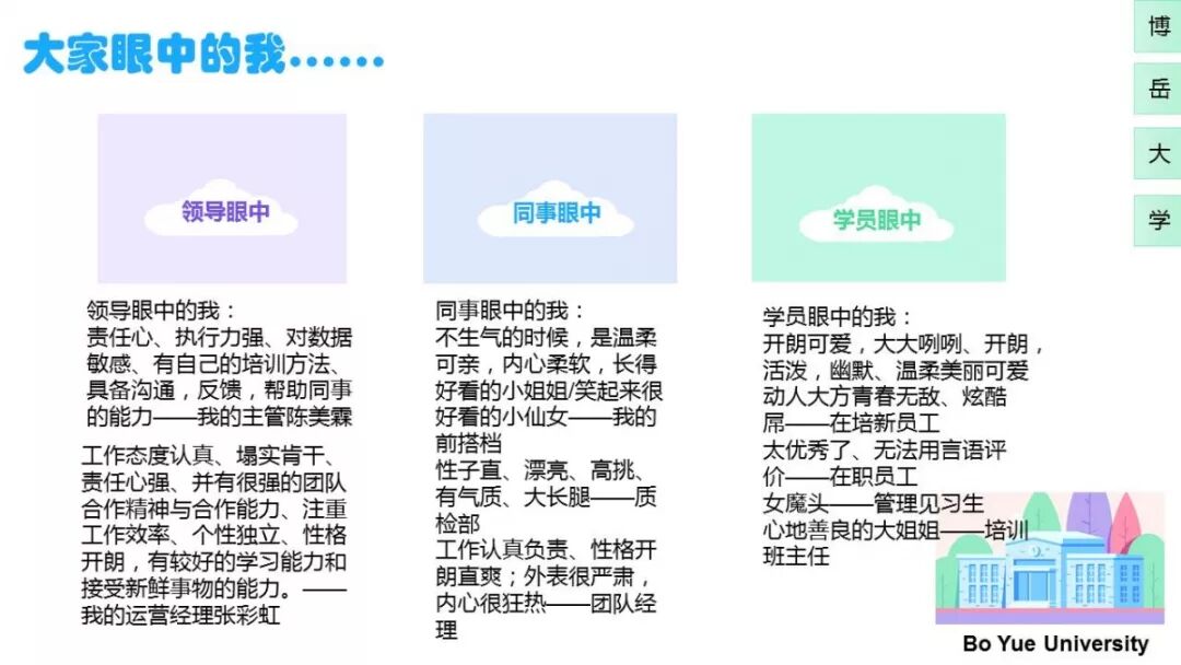 本期博岳大学最佳园丁是成都基地黄英和水碾河基地陈阳。两位优秀的老师都是如花似锦的年纪,她们怀揣着自己的梦想站在博岳大学的讲台,奉献着自己的努力和汗水,相信:她们一定骄傲自己是一名博岳人,梦想终有一天会实现。