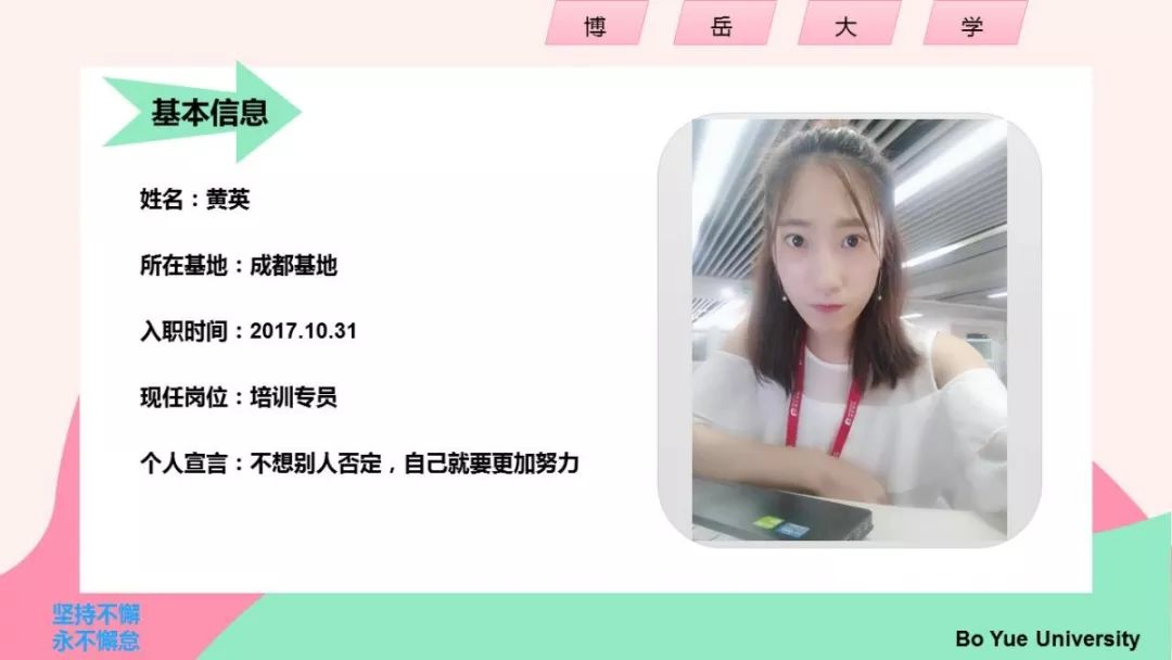 首先要介绍给大家认识的是成都基地博岳讲师—黄英,她2017年以管理见习生的身份入职博岳,自此已有一年时光,从一线话务员到培训专员,带过团队也带过入职新员工。在工作中,她时刻秉承着踏实、认真、负责的态度。公司因为有此优秀员工感到骄傲。