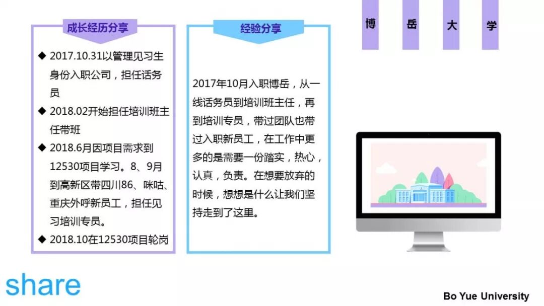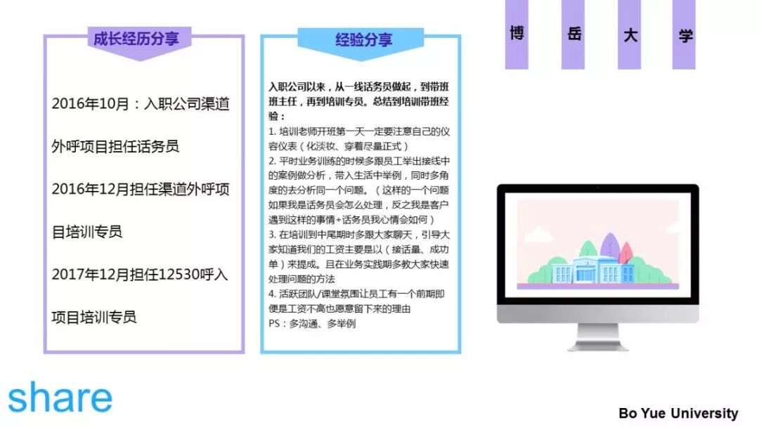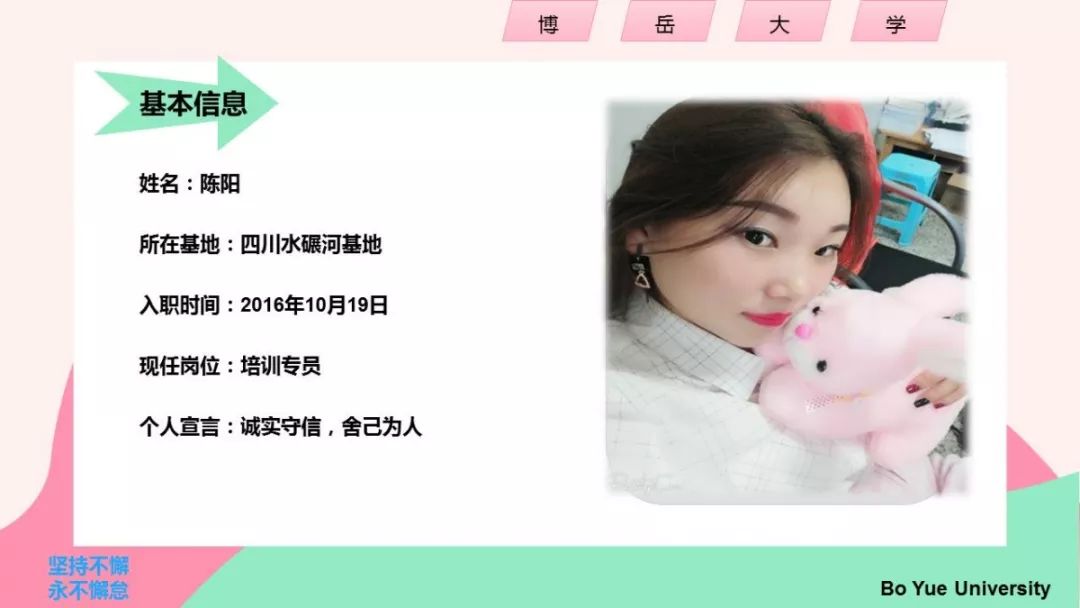 下面要介绍的是四川水碾河基地—陈阳,陈阳是2016年10月份入职博岳。入职以后,从一线话务员做起,到带班班主任,再到培训专员,总结出来凤舞的工作经验分享给大家参考学习。