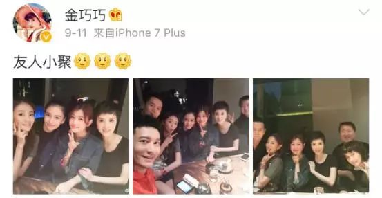 9月11日晚金巧巧在微博晒了一组友人小聚的照片,超强的朋友圈阵容惊呆网友,几乎都是演艺圈大牌,没想到一向低调金巧巧与他们竟然是好友。照片中有黄晓明baby夫妇,安以轩与老公陈荣炼,陈妍希及澳门赌王之女何超仪,看得出聚会氛围其乐融融。
