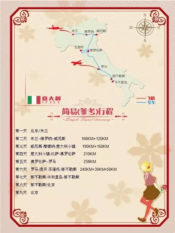 v 拜访意大利四大名城:罗马(梵蒂冈)、佛罗伦萨、米兰、威尼斯。