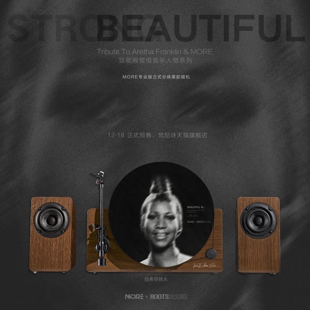 MORE联合ROOTS HOUSE设计致敬Aretha Franklin系列专业级立式分体黑胶唱机,期待大家通过黑胶专辑重返Aretha Franklin经典现场,在黑胶的旋转中享受Queen Of Soul的音乐魅力。